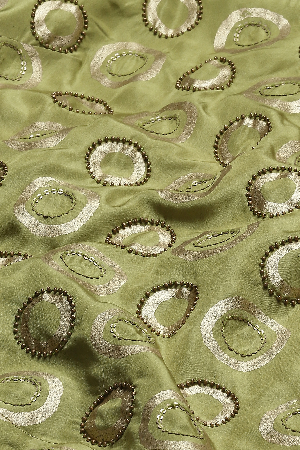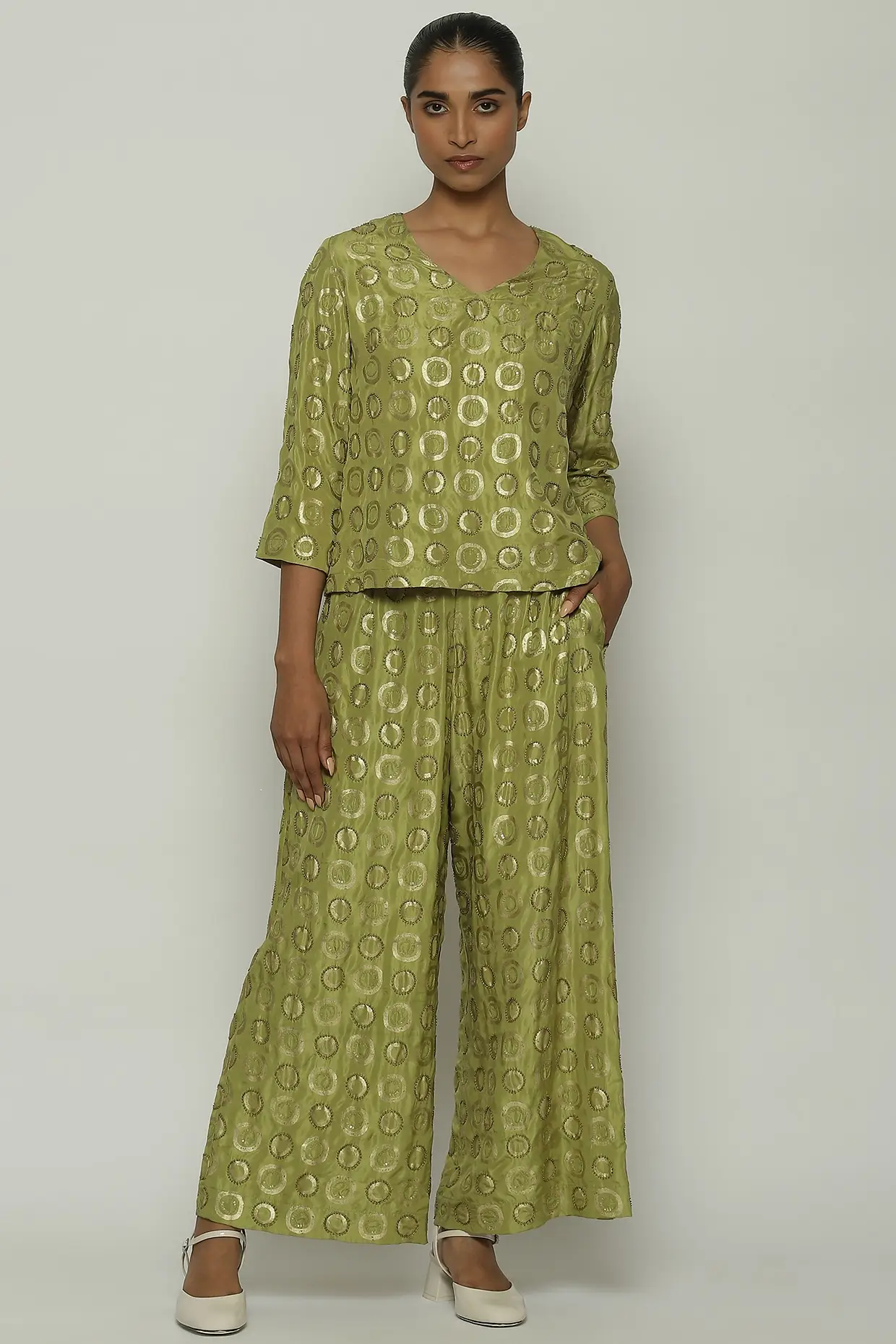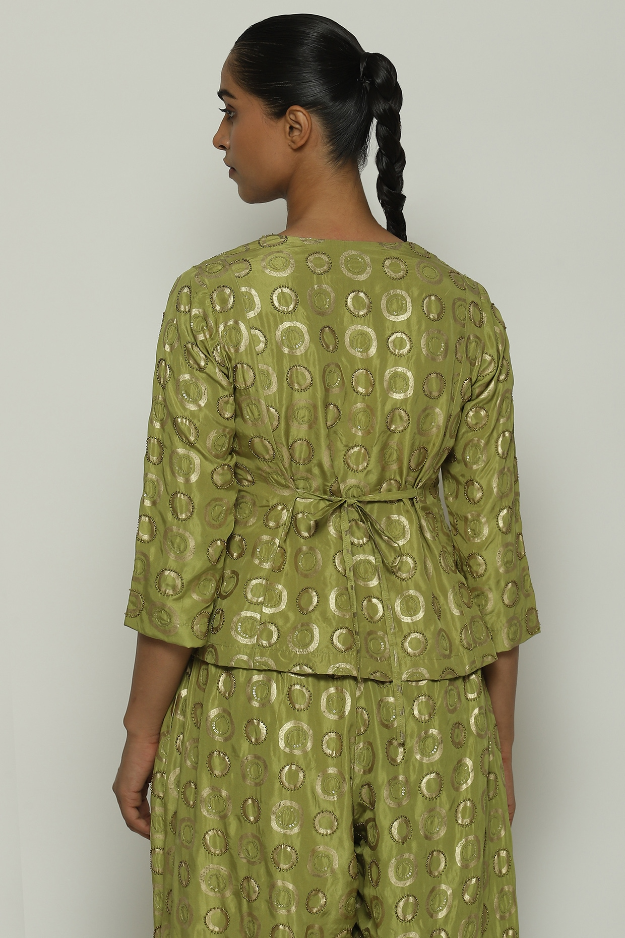 Featuring an amla green top in habutai silk base with foil print, thread, sequins, metal strips, pearl and beads hand embroidery. Accentuate it with pants, hoop earrings and flats for casual wear.