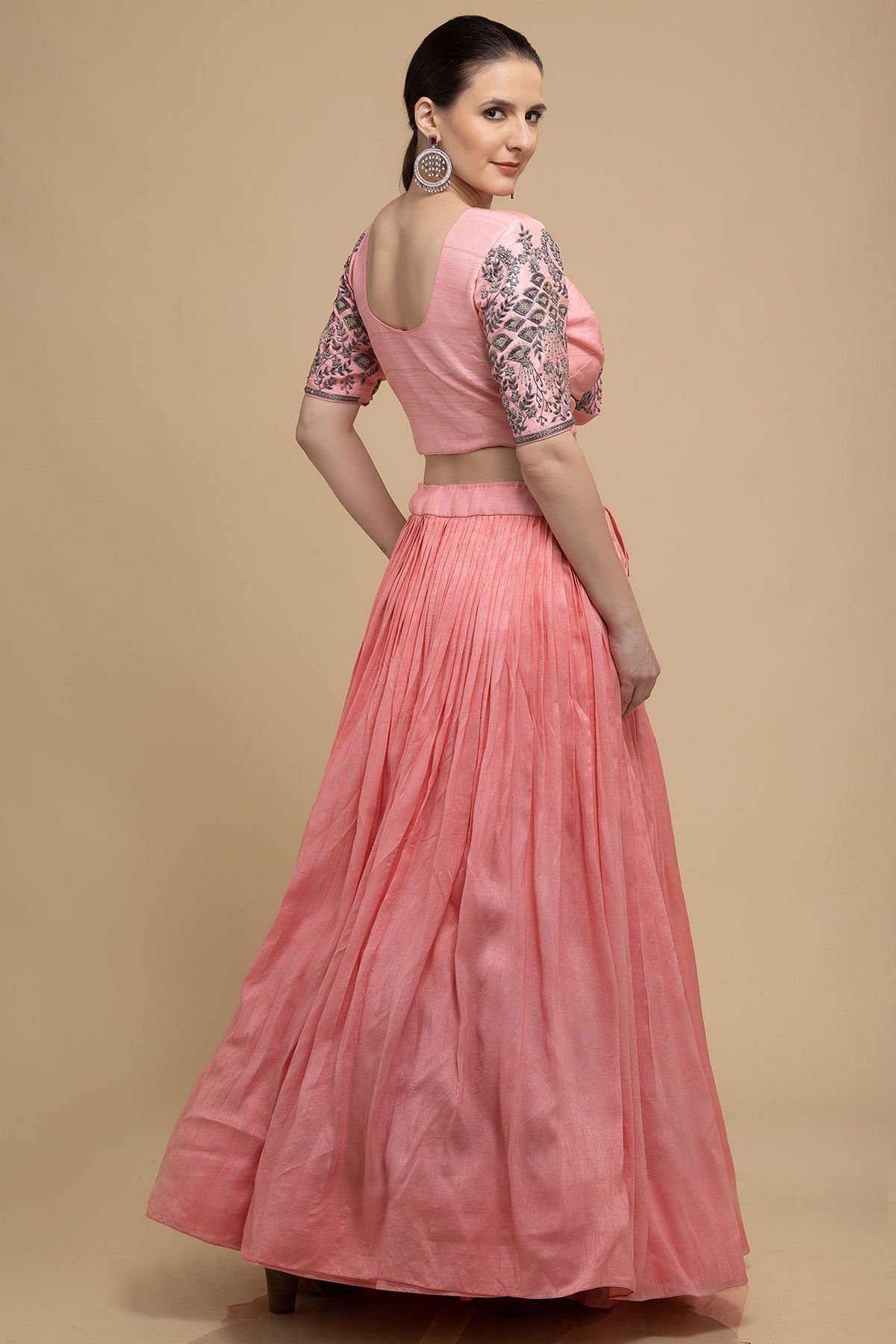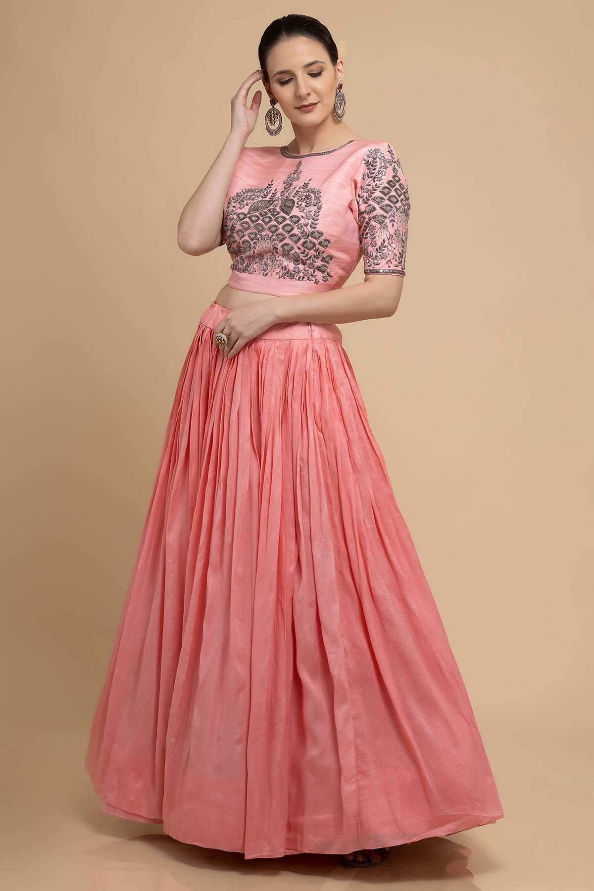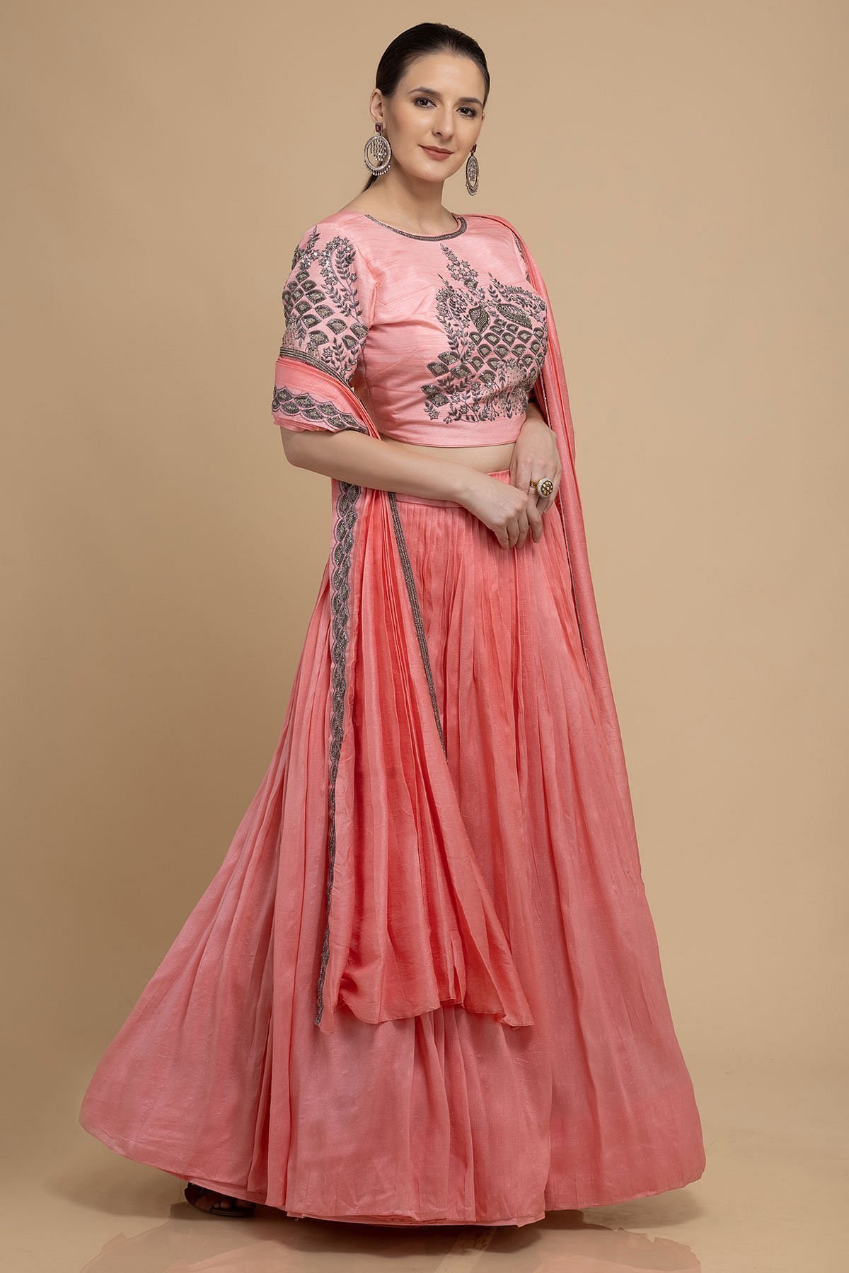Simple yet captivating lehenga set to style your initimidate celebrations with grace and elegance, hued in Coral Pink crafted from silk ensures a crisp and smart appearance. Features a cutdana, sequins and bead embroidered readymade blouse, gathered skirt and a dupatta. There might be a little color variation in the image and original product due to photographic lighting sources or your monitor settings.