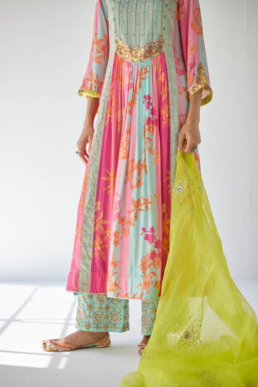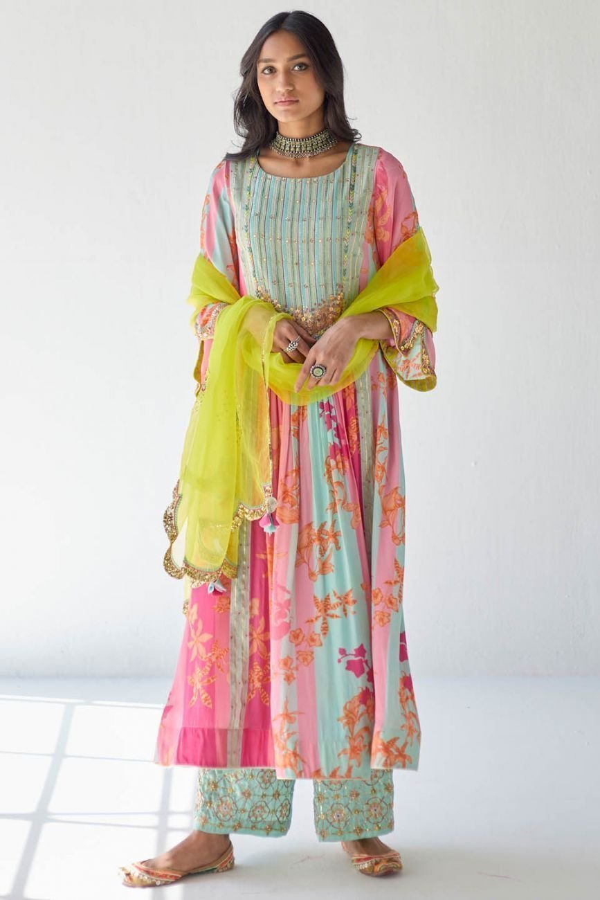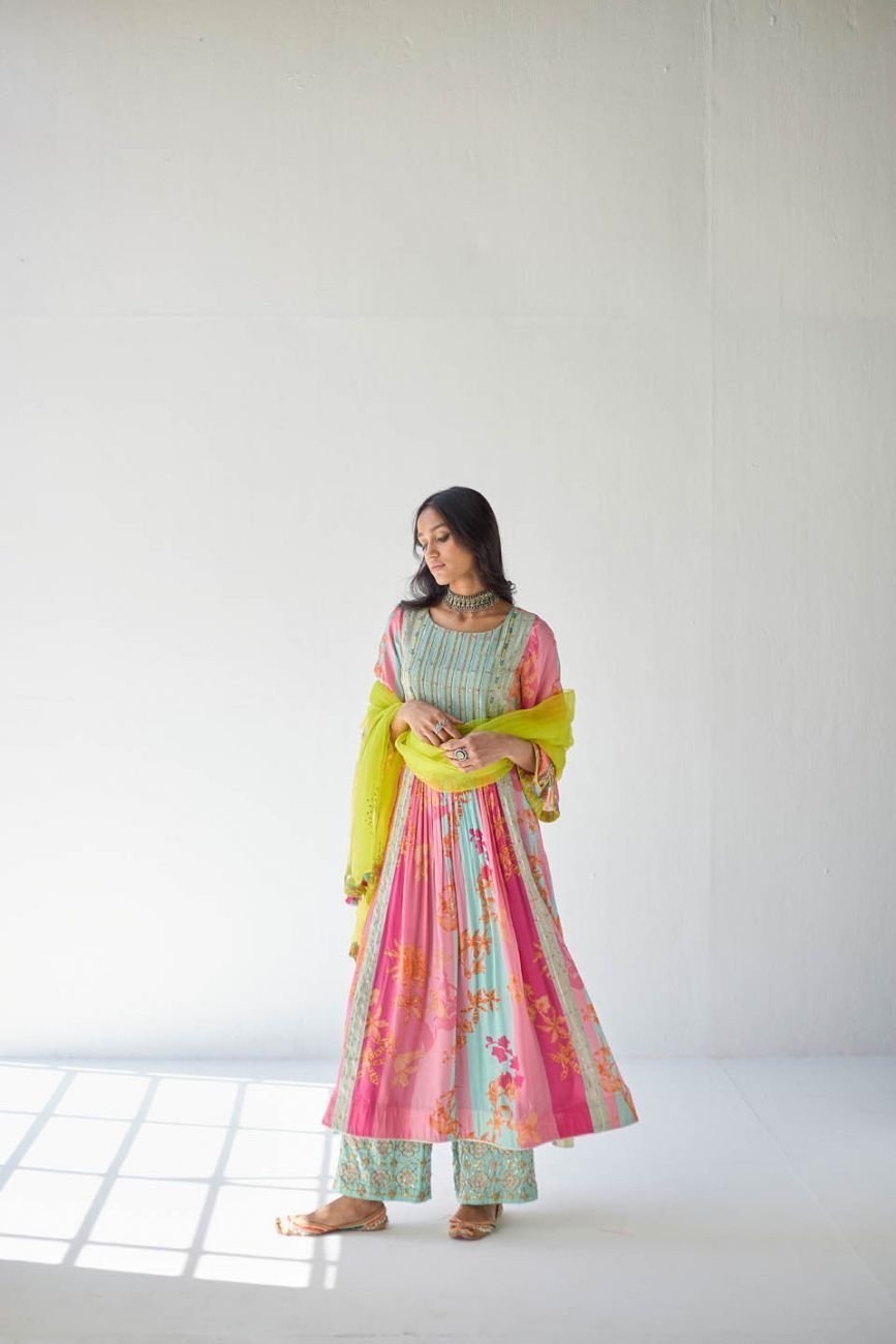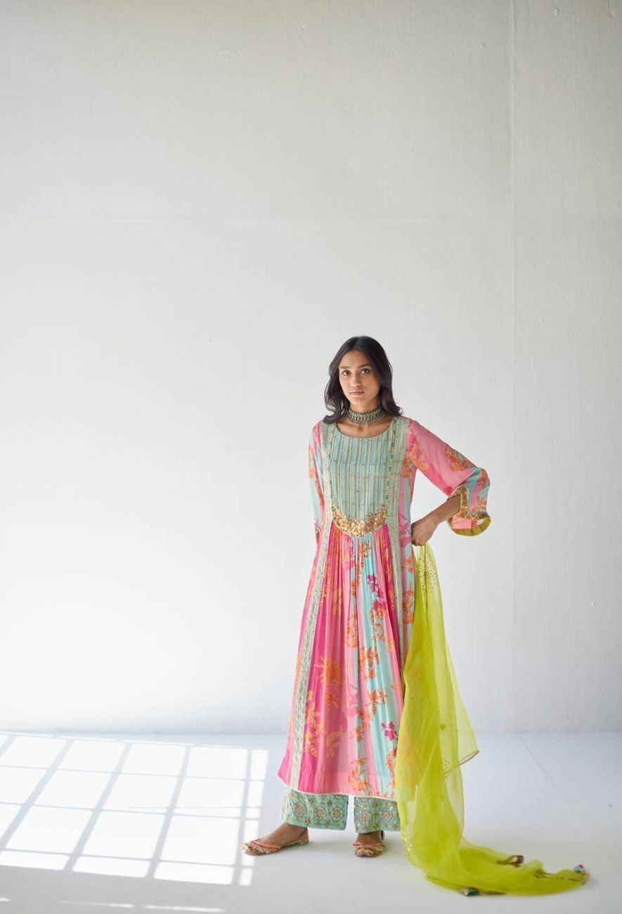 - Pink printed kurta set with blue hand embroidered pallazo and lime green organza dupatta