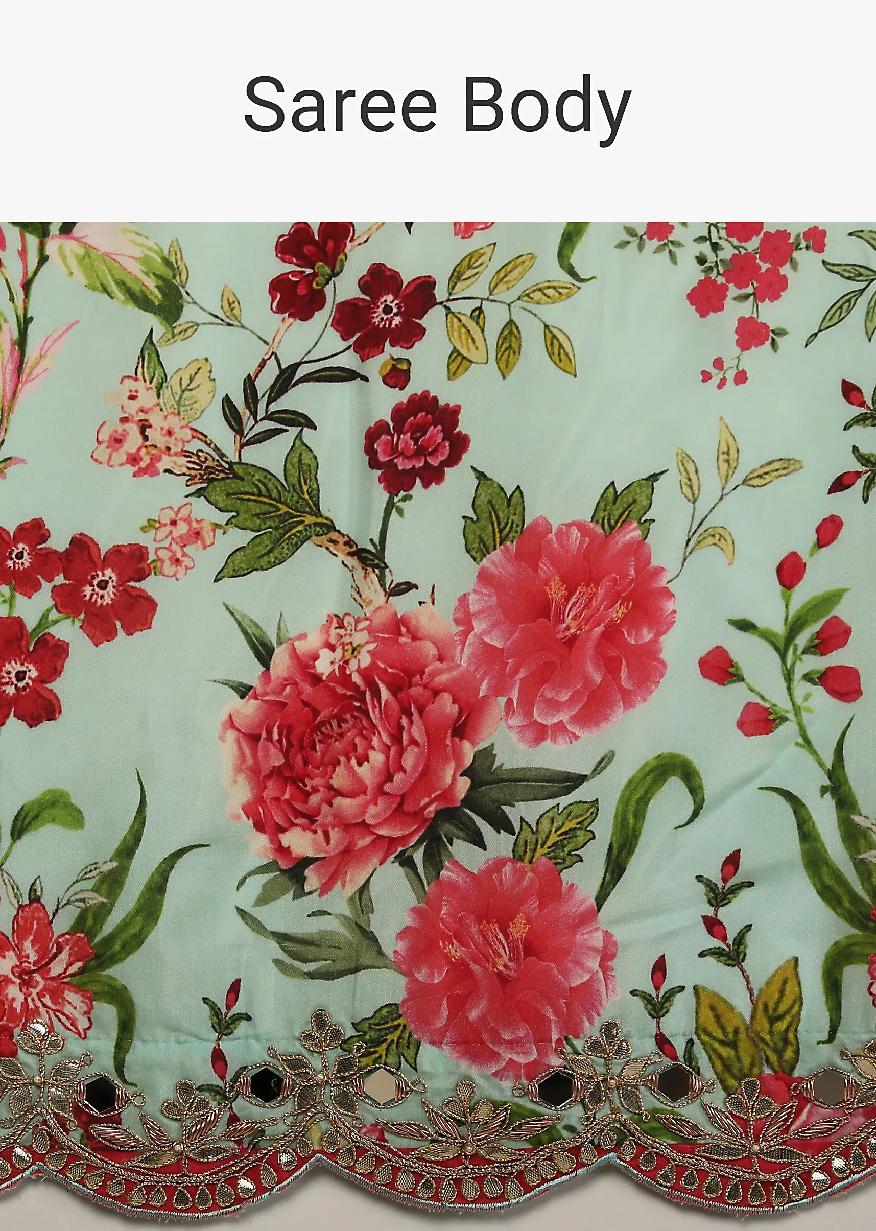 Mint Saree In Cotton Silk With Contrasting Floral Print And Gotta Embroidered Scallop Border quantity
